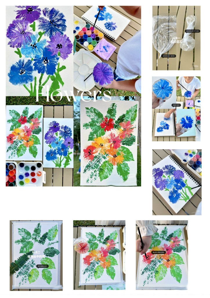 1、学习用充气塑料袋拓印花瓣,创作色彩丰富的花朵