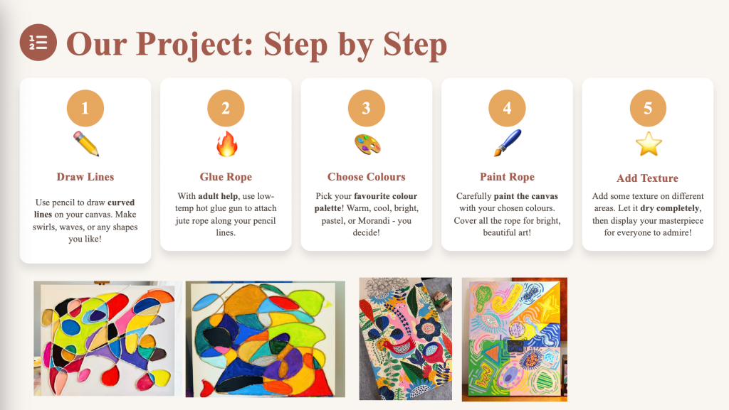 - Learn colour layering, texture techniques, and use glitter glue to enhance visual effects.