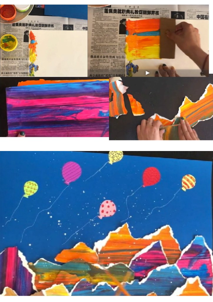 教学过程:先给学生看丹霞地貌的实景拍摄照片,讲解形成的原因,然后教学生如何用纸板刮出不同的颜色肌理,如何把纸撕出山的形状,最后教学生画气球,设计出不同图案的气球样式