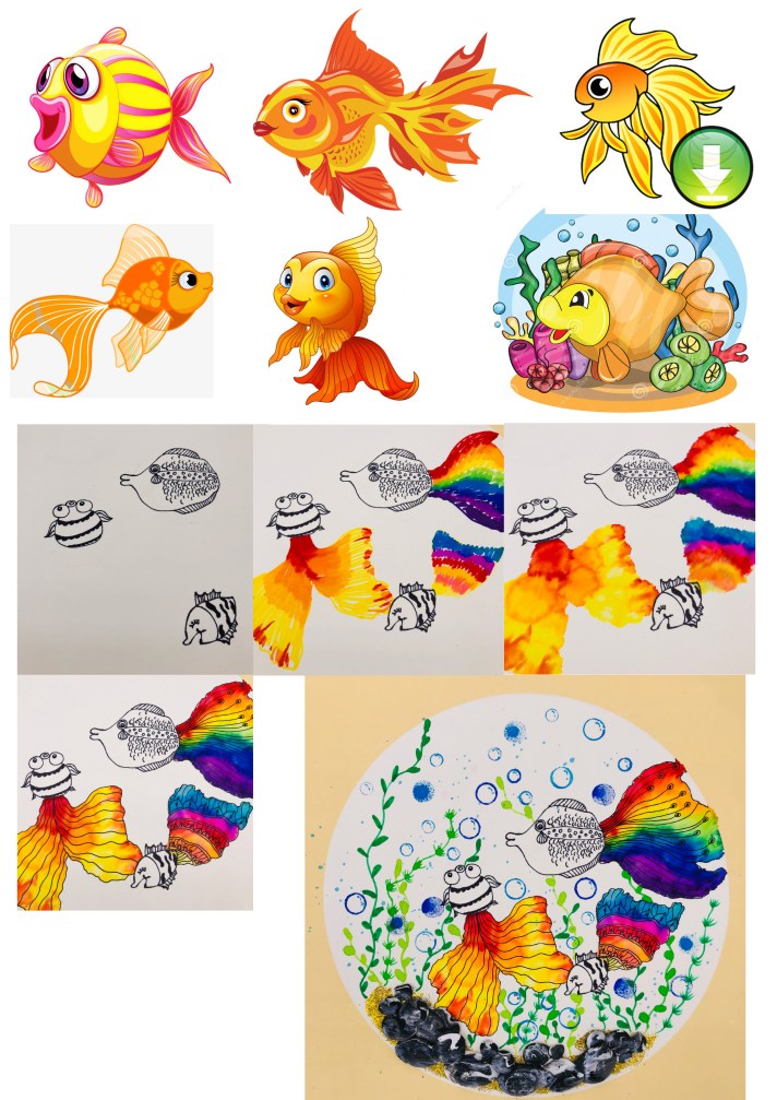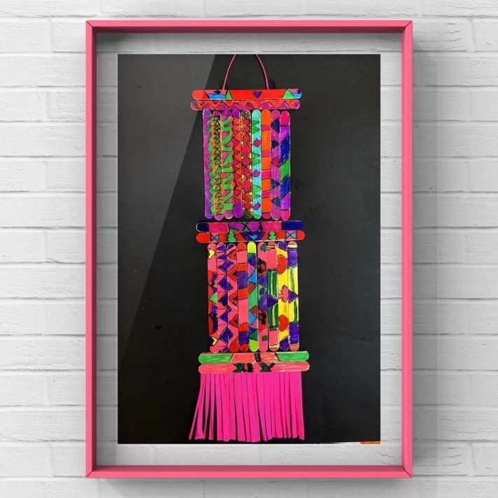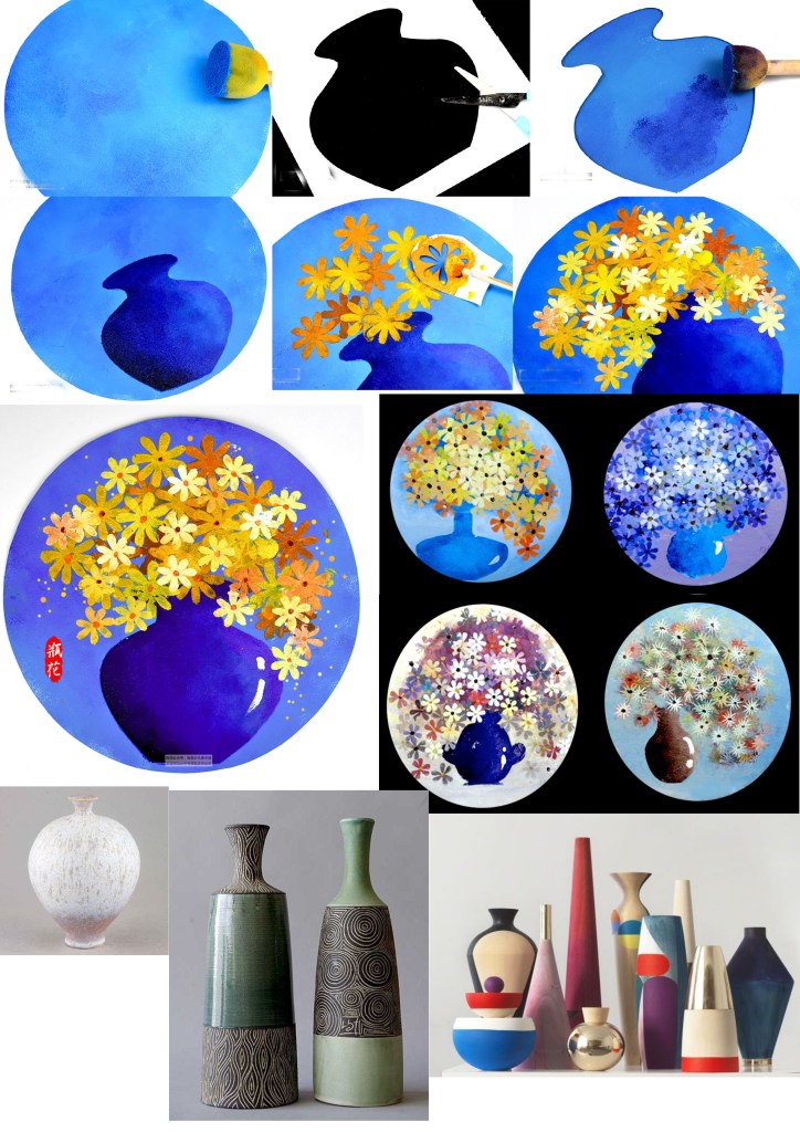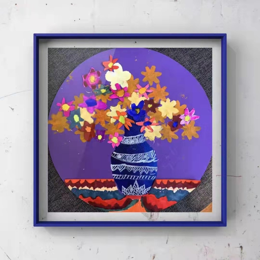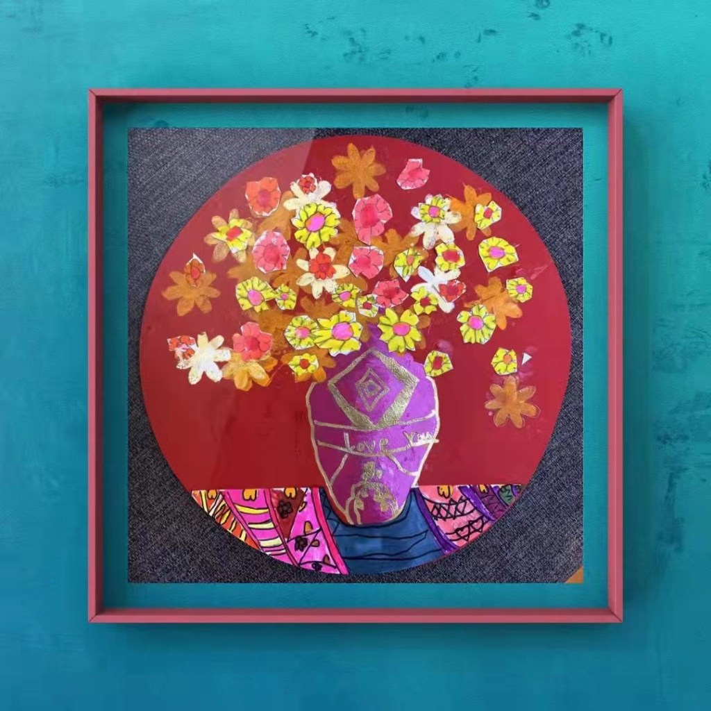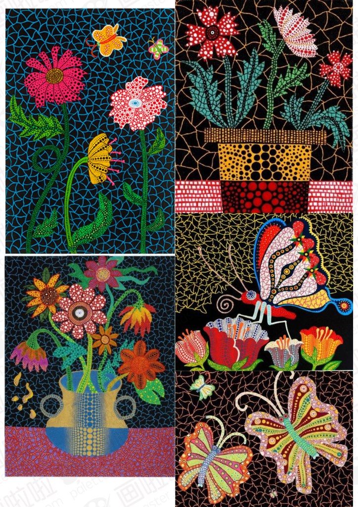 教学过程:先给学生介绍草间弥生的生平,给学生看她的作品,了解她和时尚名牌合作的各种设计。然后讲深色背景上如何搭配颜色,最后让学生画出自己喜欢的花和蝴蝶并进行圆点装饰上色。