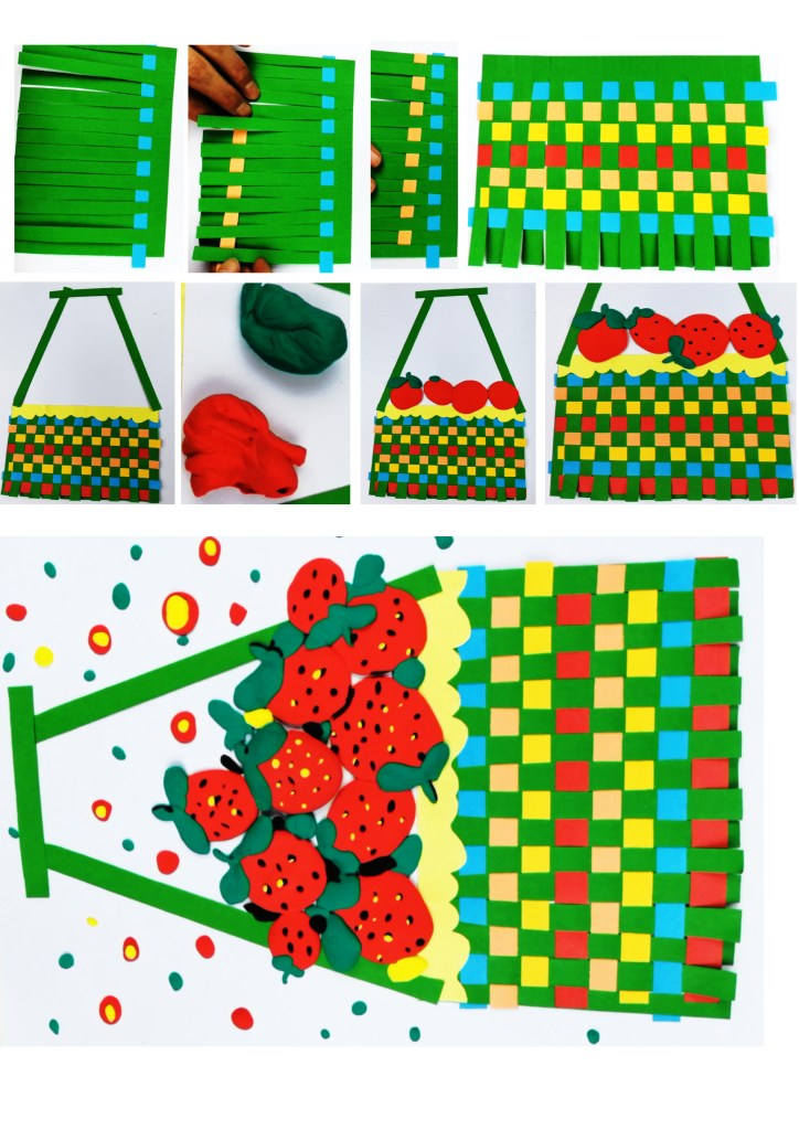 教学过程:先给学生看草莓和果篮的形状颜色,一起画一到两个草莓,然后演示如何把各种颜色的纸条编织到一起。最后教学生怎么用彩泥做草莓做背景