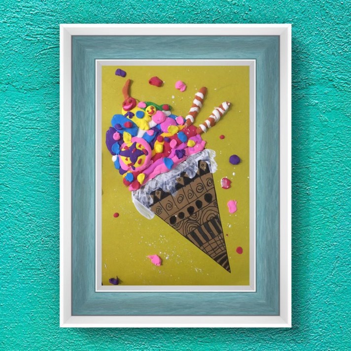 教学过程:先教学生如何利用中心线画对称图形,如何用不同颜色的水彩笔做简单的装饰。然后演示彩泥造型过程中的各种技巧,让学生学会用不同大小的圆形曲线做冰淇淋。最后教学生如何用两只毛笔做出颜色不一的背景装饰