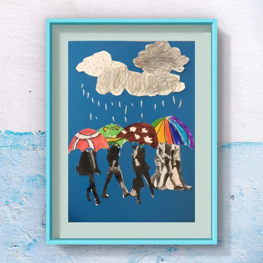教学过程:先给学生讲解什么是黑白灰,然后教他们怎么用炭笔画出云朵黑白灰关系,最后我们一起剪出漂亮的不同颜色的雨伞并给他们做线性装饰图案