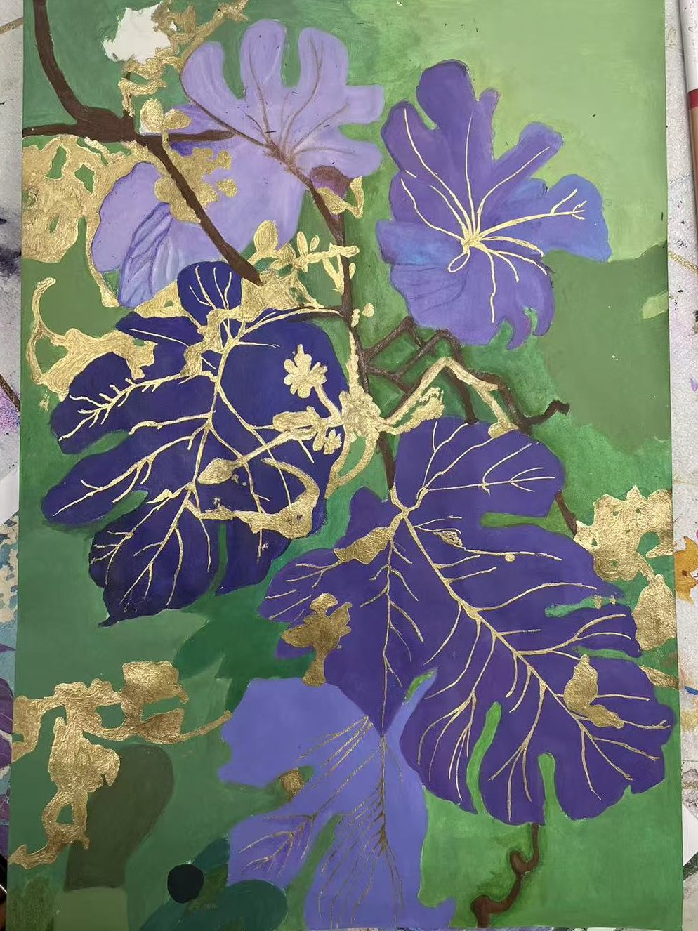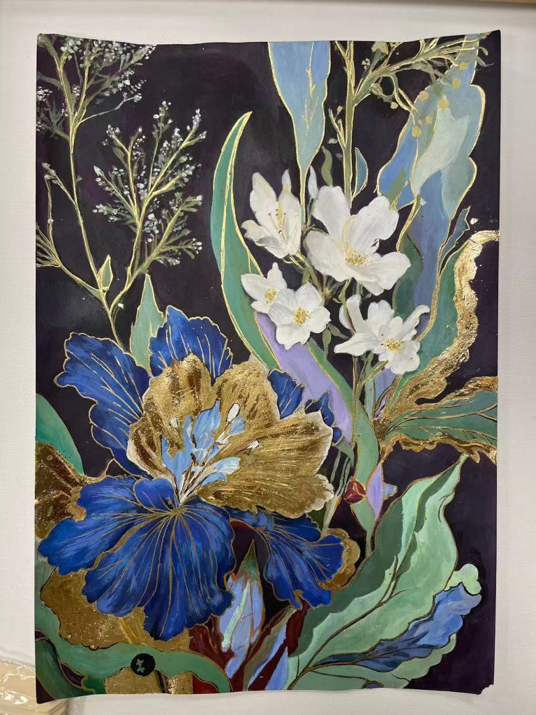 - 探索丙烯花卉绘画与金箔装饰结合的表现效果。