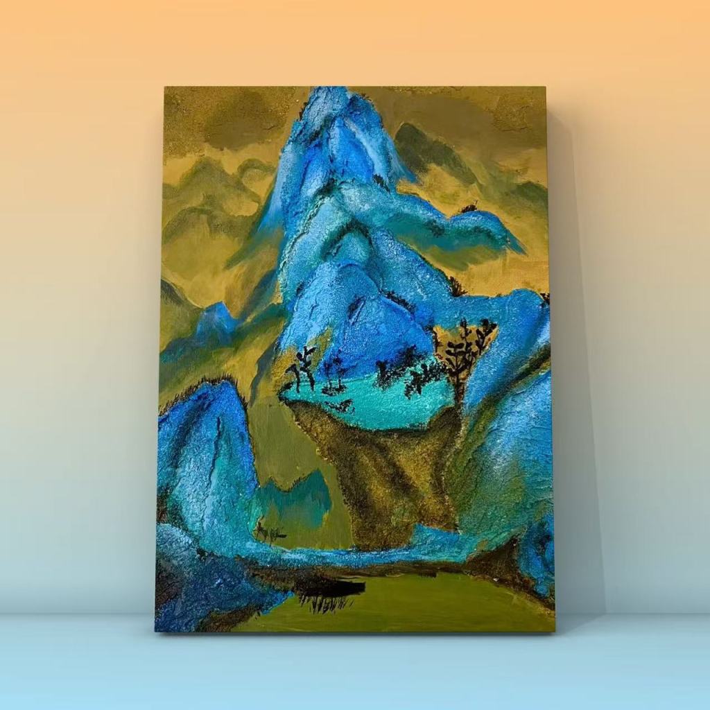 - 探索石英沙与颜料结合的材料特性与画面效果。