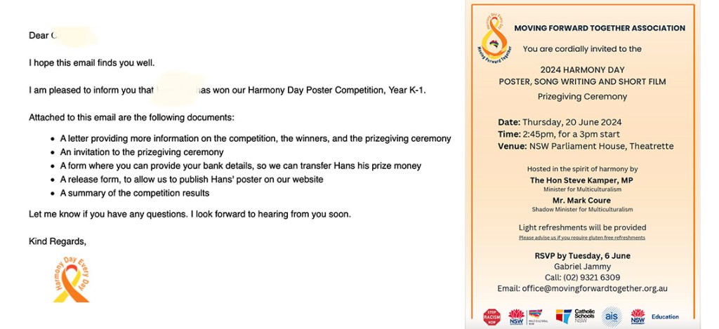 Harmony Day Art Competition是澳洲地区非常著名的一个儿童绘画比赛。澳洲作为移民国家,各个民族友好和谐的和平共处一直是大家提倡和推崇的。这个比赛希望孩子们通过海报视频设计,从小就能有人人平等的理念,在校园生活中杜绝一切种族歧视的言行。