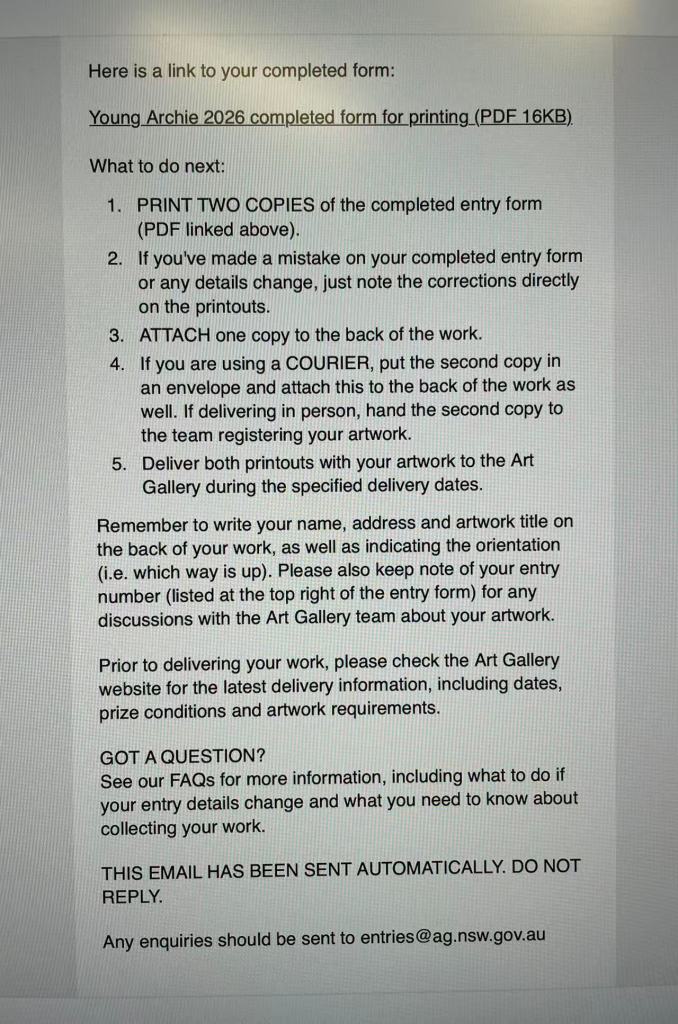 Winning and finalist artworks are usually exhibited at the Art Gallery of New South Wales, one of Australia’s most respected art institutions. Having artwork displayed there is a rare and honourable opportunity for young artists.